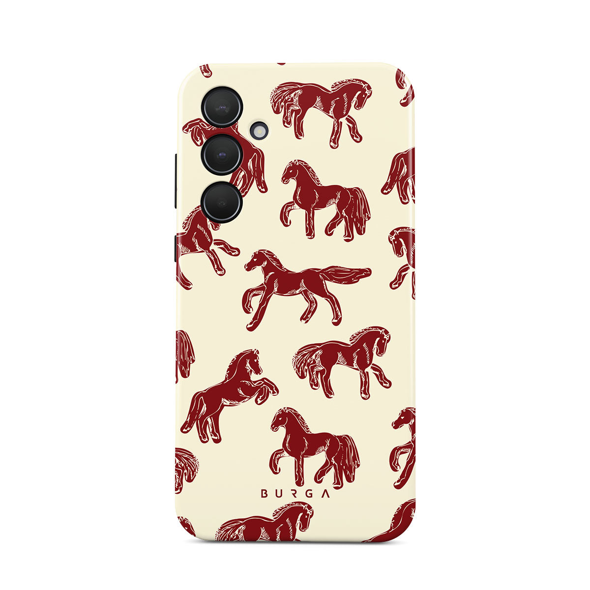 It's time to unleash your wild side with the Mustang design. Bold red horses gallop across a nude background, capturing the spirit of untamed adventure. This Samsung Galaxy A35 phone case is perfect for the free-spirited souls ready to ride into the unknown.
