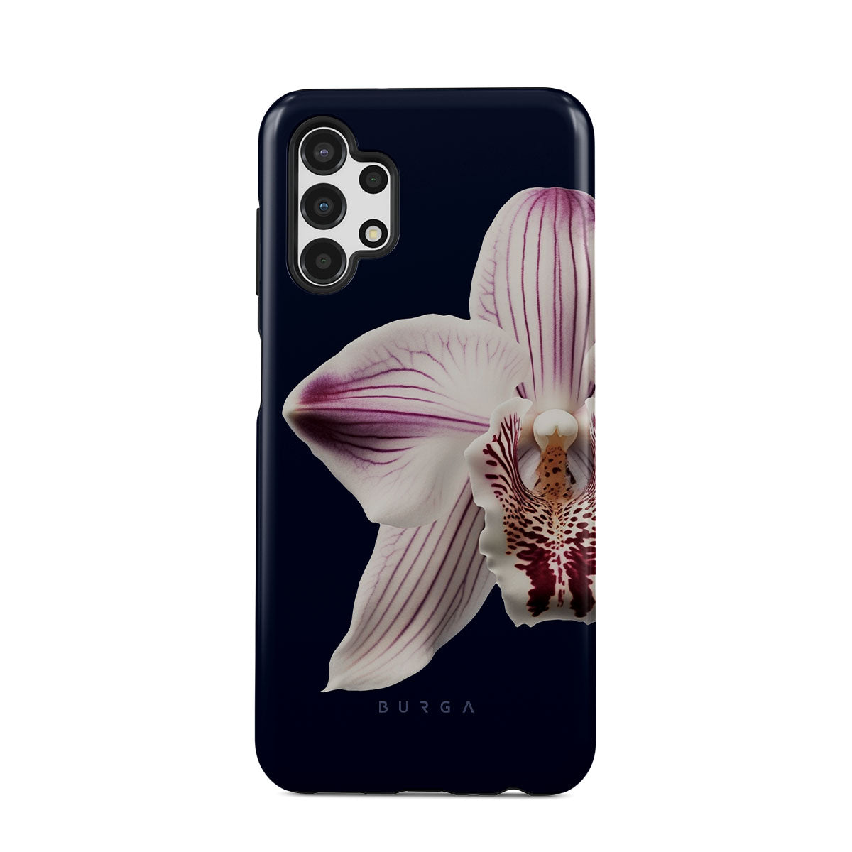 The white orchid blooms boldly upon a night sky blue, a beacon of clarity in the darkness. Our Nectar Samsung Galaxy A13 4G phone case design speaks to the soul's desire to find light within, to illuminate the hidden paths of self-discovery that only reveal themselves under the cloak of introspection.