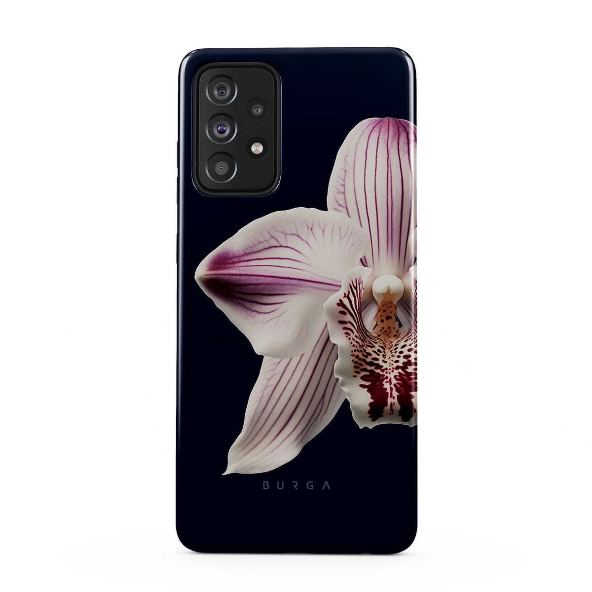 The white orchid blooms boldly upon a night sky blue, a beacon of clarity in the darkness. Our Nectar Samsung Galaxy A52 / A52S 4G / 5G phone case design speaks to the soul's desire to find light within, to illuminate the hidden paths of self-discovery that only reveal themselves under the cloak of introspection.