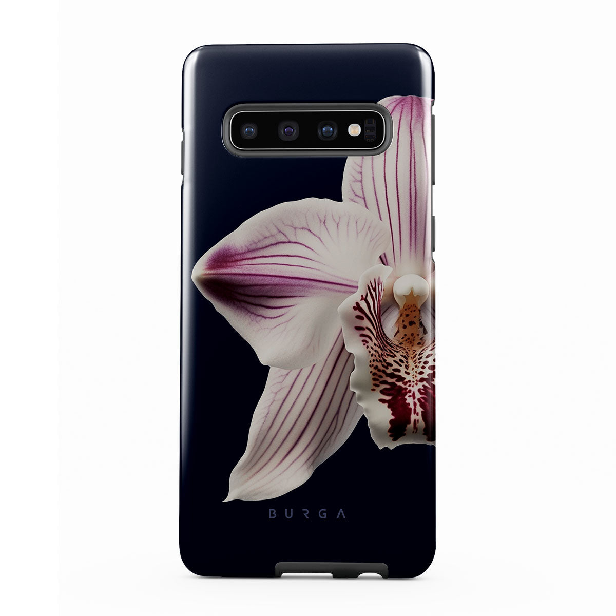 The white orchid blooms boldly upon a night sky blue, a beacon of clarity in the darkness. Our Nectar Samsung Galaxy S10 4G phone case design speaks to the soul's desire to find light within, to illuminate the hidden paths of self-discovery that only reveal themselves under the cloak of introspection.