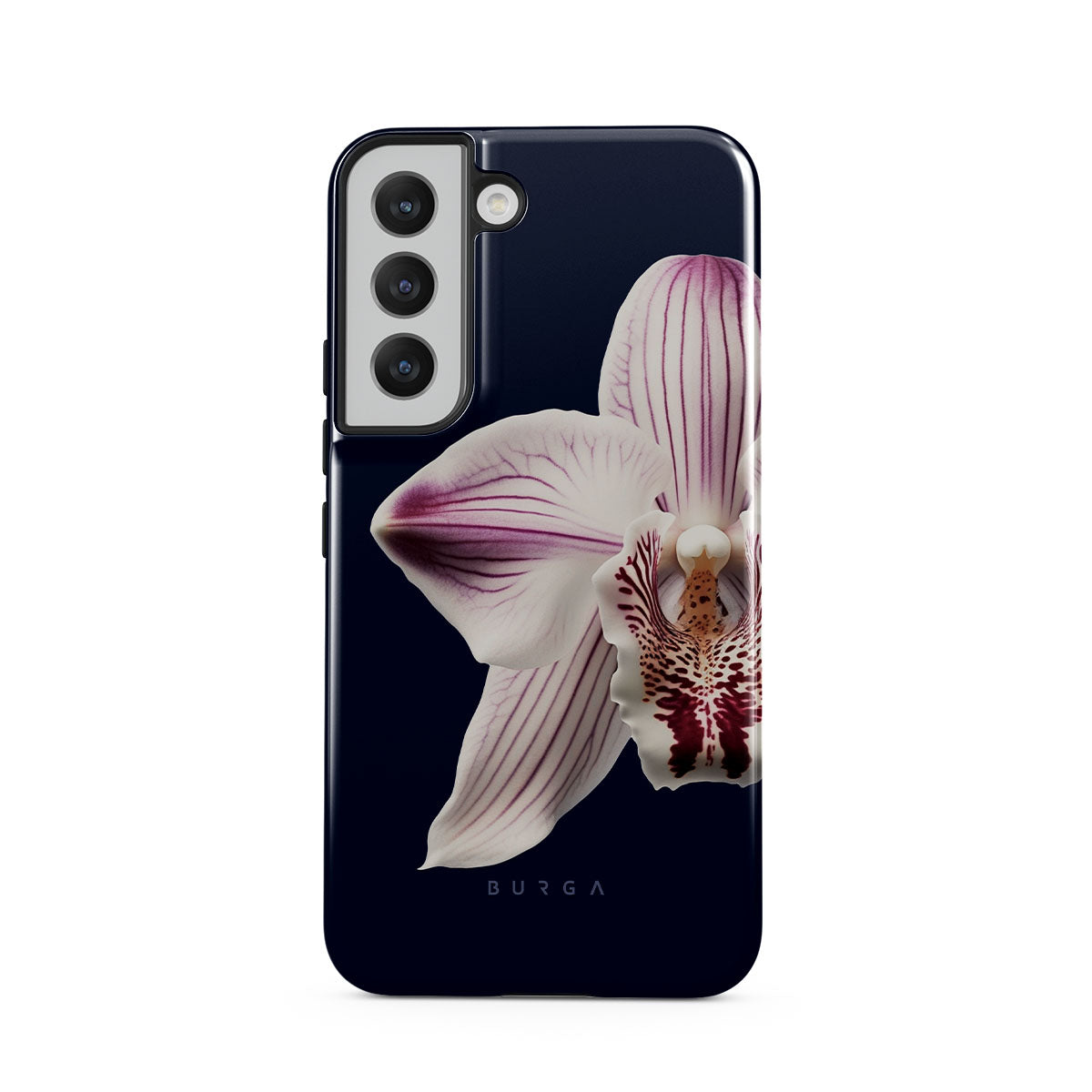 The white orchid blooms boldly upon a night sky blue, a beacon of clarity in the darkness. Our Nectar Samsung Galaxy S22 Plus phone case design speaks to the soul's desire to find light within, to illuminate the hidden paths of self-discovery that only reveal themselves under the cloak of introspection.