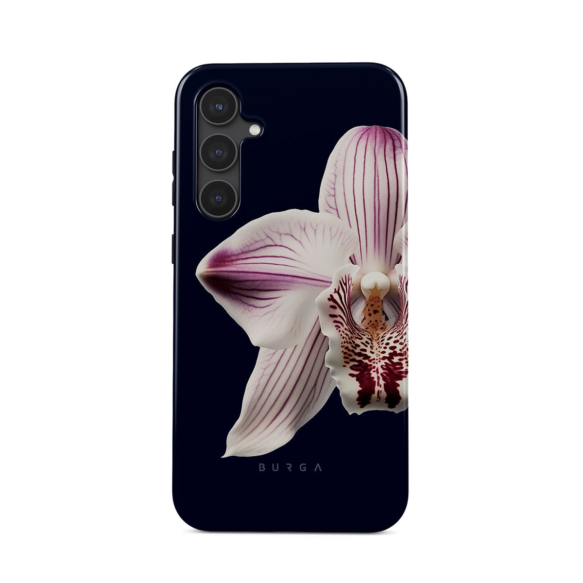 The white orchid blooms boldly upon a night sky blue, a beacon of clarity in the darkness. Our Nectar Samsung Galaxy S23 FE phone case design speaks to the soul's desire to find light within, to illuminate the hidden paths of self-discovery that only reveal themselves under the cloak of introspection.