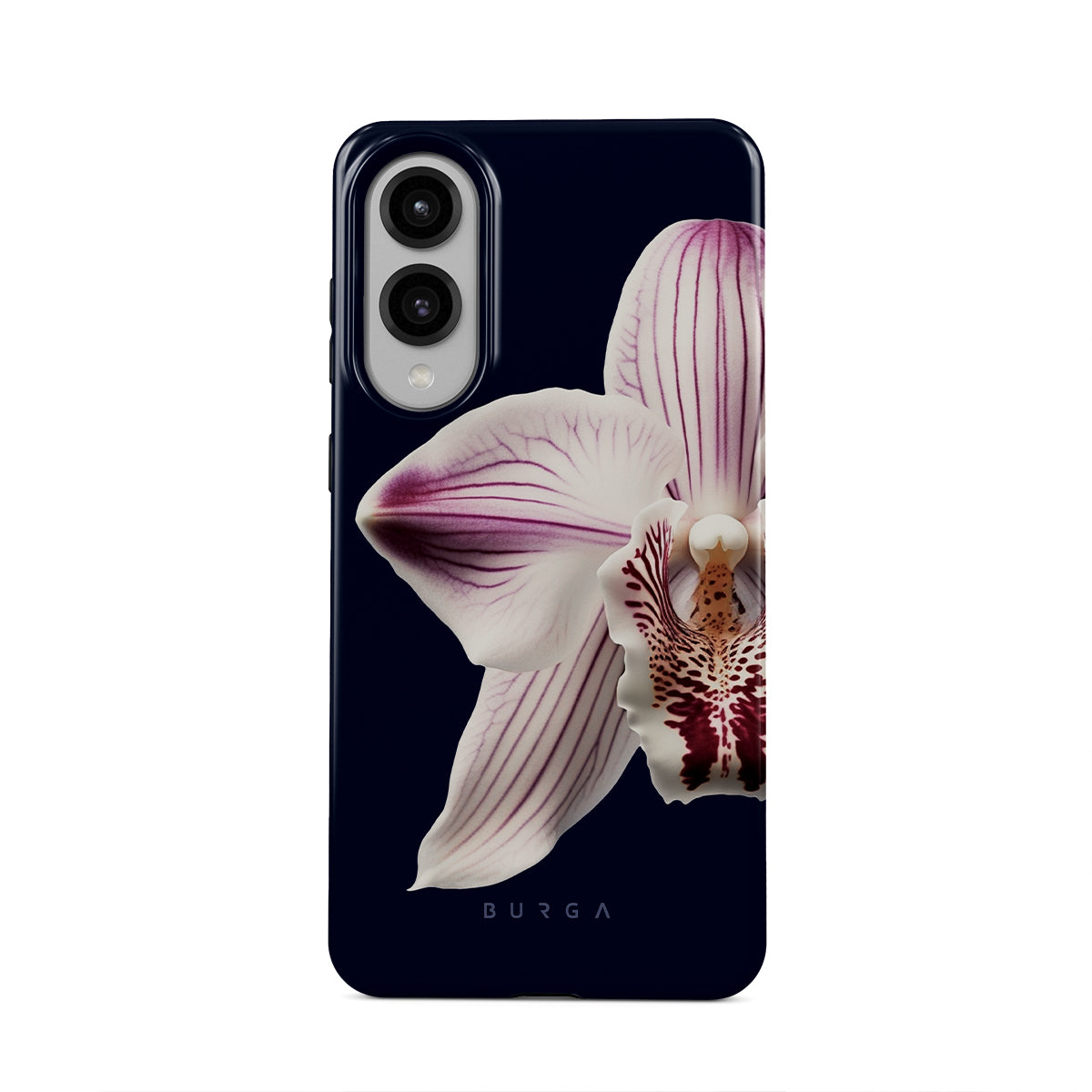 The white orchid blooms boldly upon a night sky blue, a beacon of clarity in the darkness. Our Nectar Samsung Galaxy S25 Edge phone case design speaks to the soul's desire to find light within, to illuminate the hidden paths of self-discovery that only reveal themselves under the cloak of introspection.