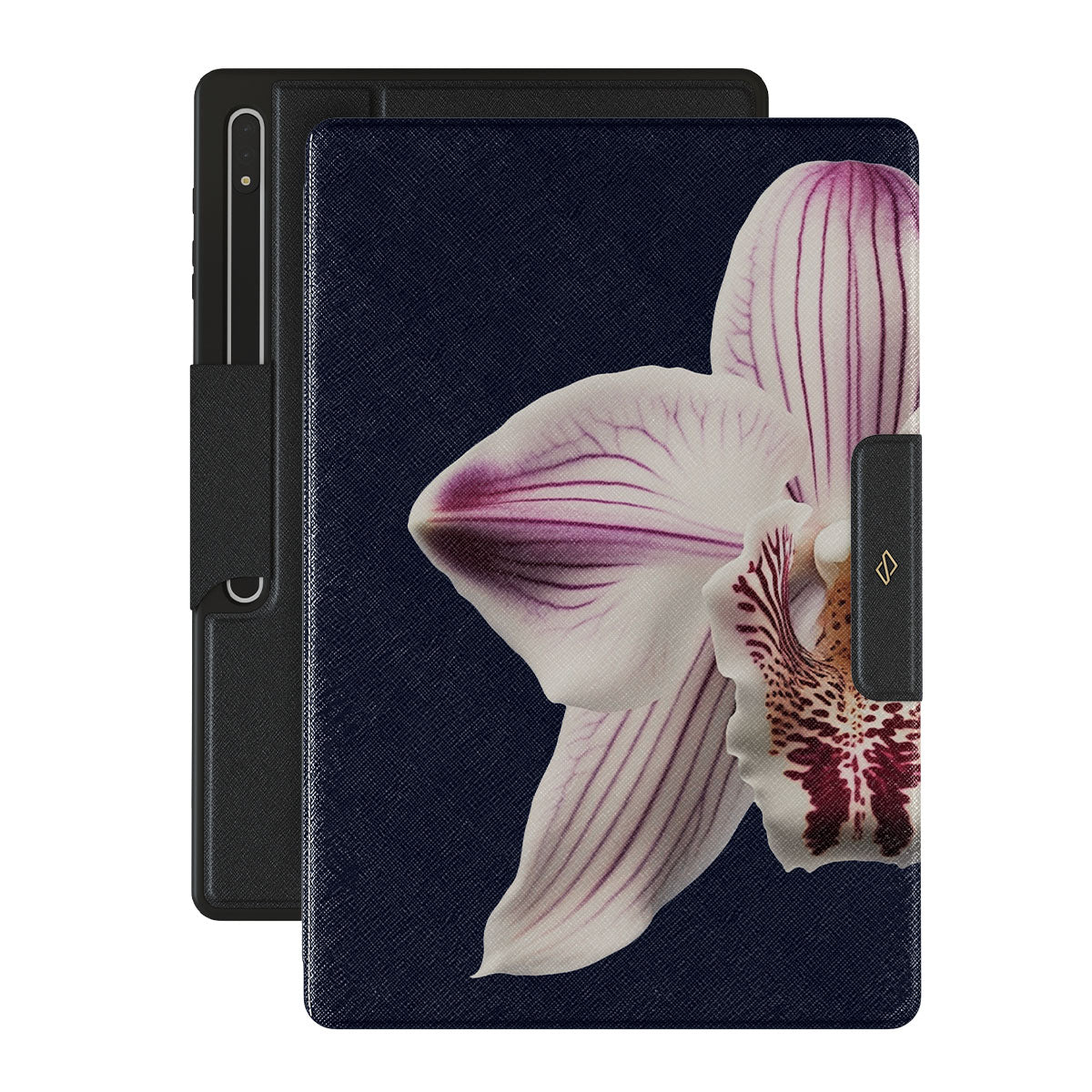 The white orchid blooms boldly upon a night sky blue, a beacon of clarity in the darkness. Our Nectar Samsung Galaxy Tab S8 Ultra folio case design speaks to the soul's desire to find light within, to illuminate the hidden paths of self-discovery that only reveal themselves under the cloak of introspection.