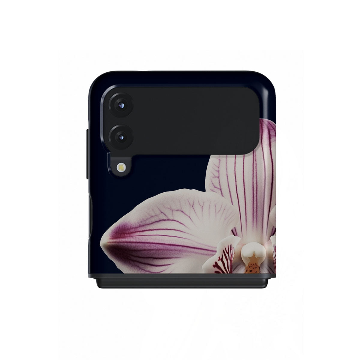 The white orchid blooms boldly upon a night sky blue, a beacon of clarity in the darkness. Our Nectar Samsung Galaxy Z Flip 3 phone case design speaks to the soul's desire to find light within, to illuminate the hidden paths of self-discovery that only reveal themselves under the cloak of introspection.