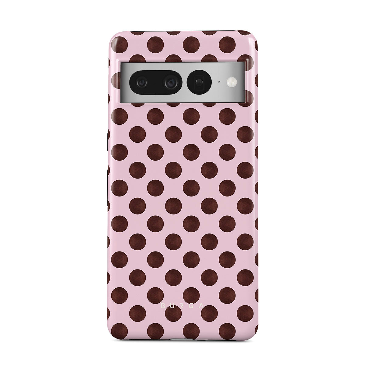 This design features: a retro polka dot pattern, pink background with brown polka dots.