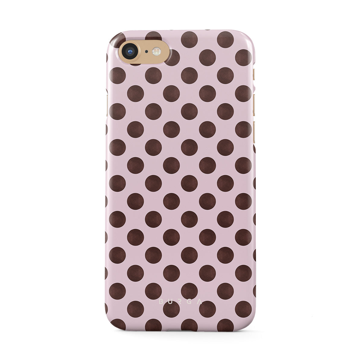 This design features: a retro polka dot pattern, pink background with brown polka dots.