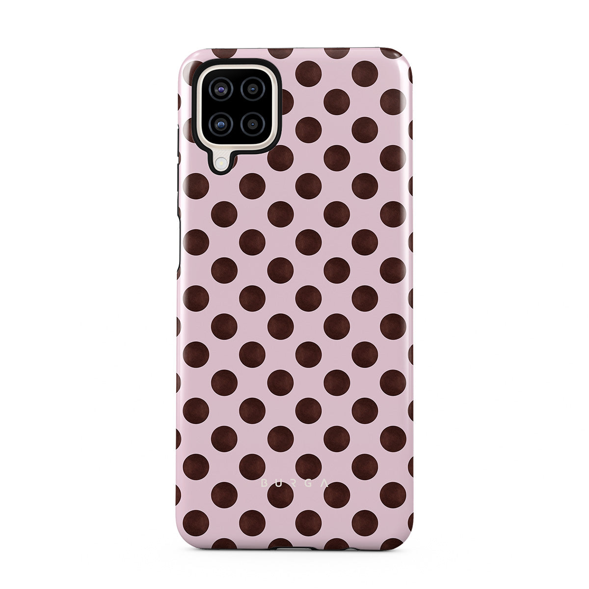 This design features: a retro polka dot pattern, pink background with brown polka dots.