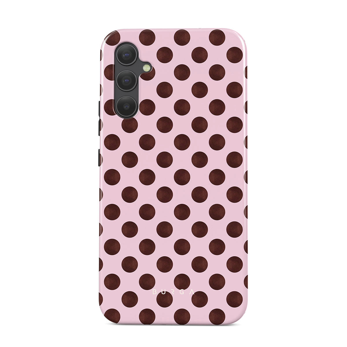 This design features: a retro polka dot pattern, pink background with brown polka dots.