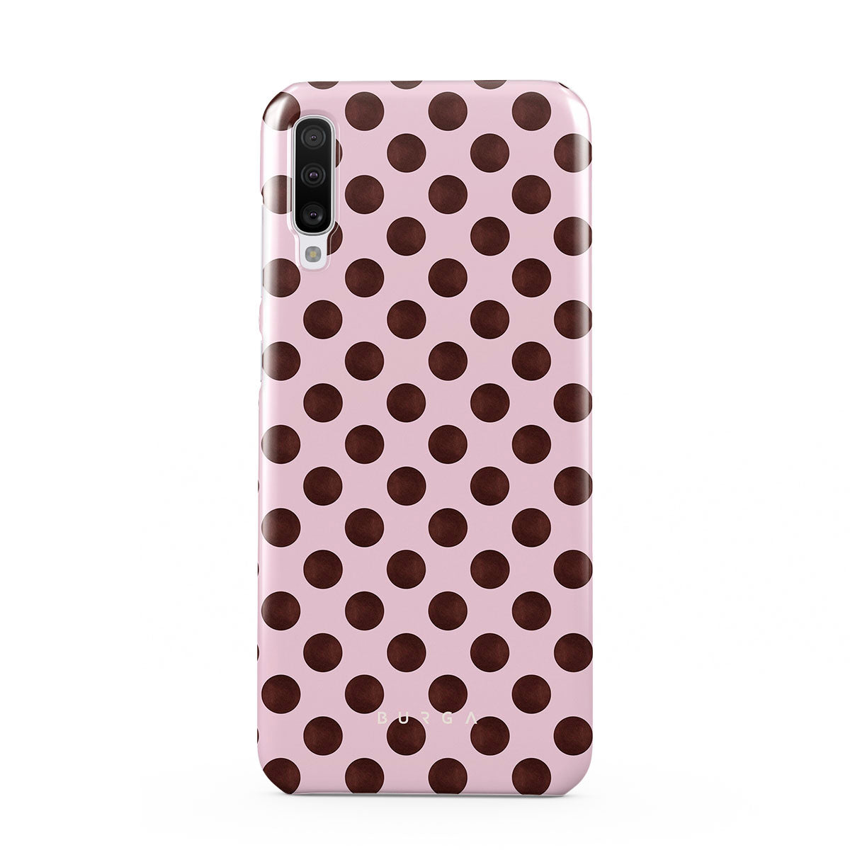 This design features: a retro polka dot pattern, pink background with brown polka dots.