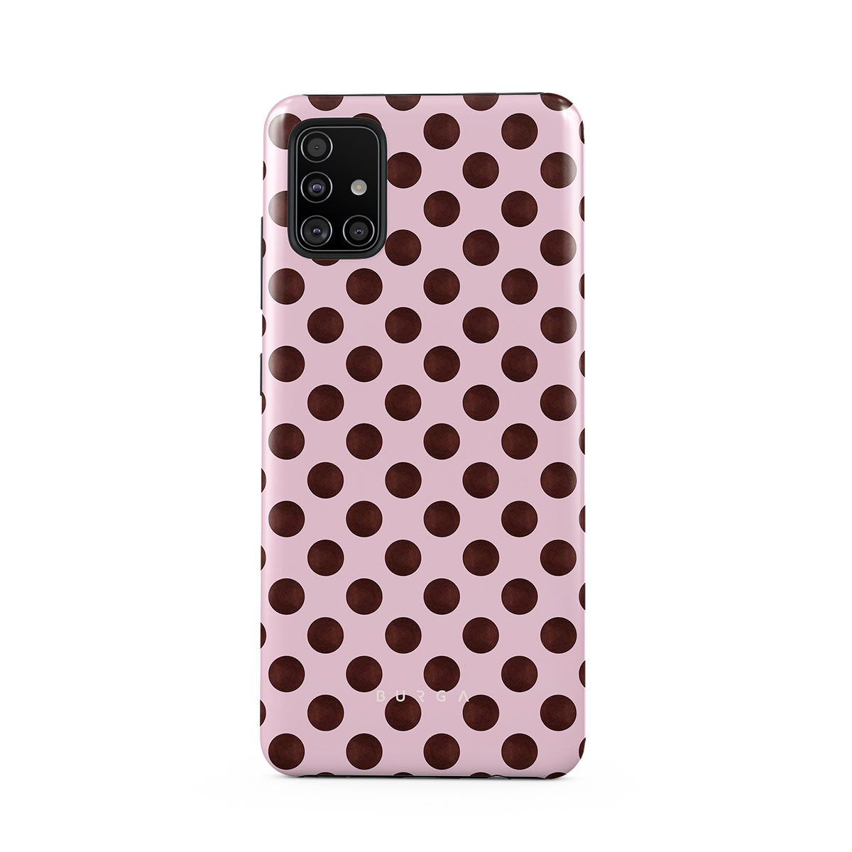 This design features: a retro polka dot pattern, pink background with brown polka dots.