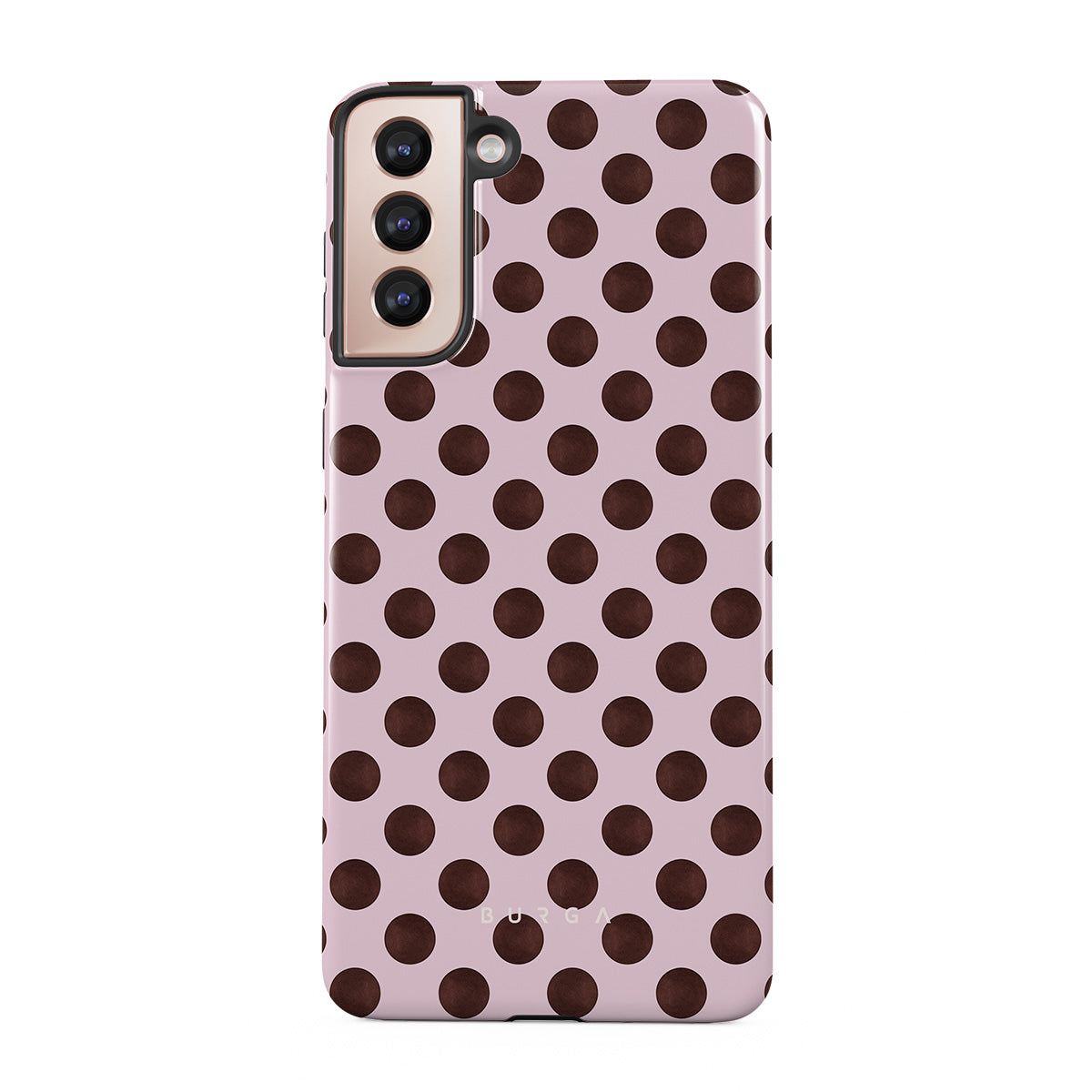 This design features: a retro polka dot pattern, pink background with brown polka dots.