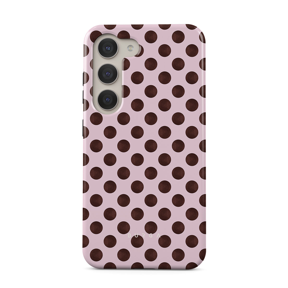 This design features: a retro polka dot pattern, pink background with brown polka dots.