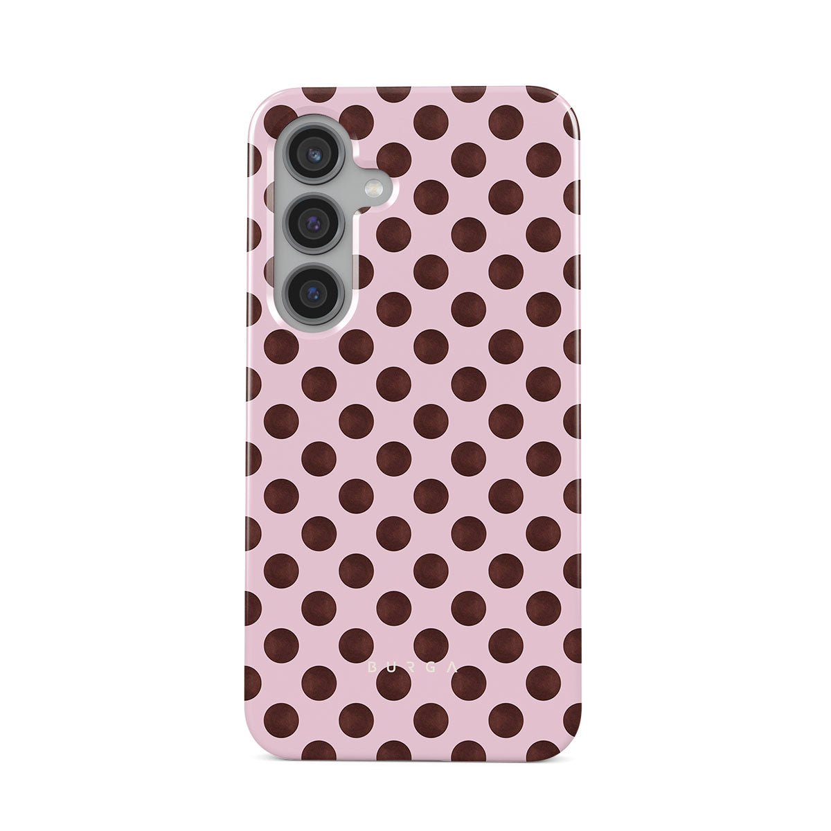 This design features: a retro polka dot pattern, pink background with brown polka dots.