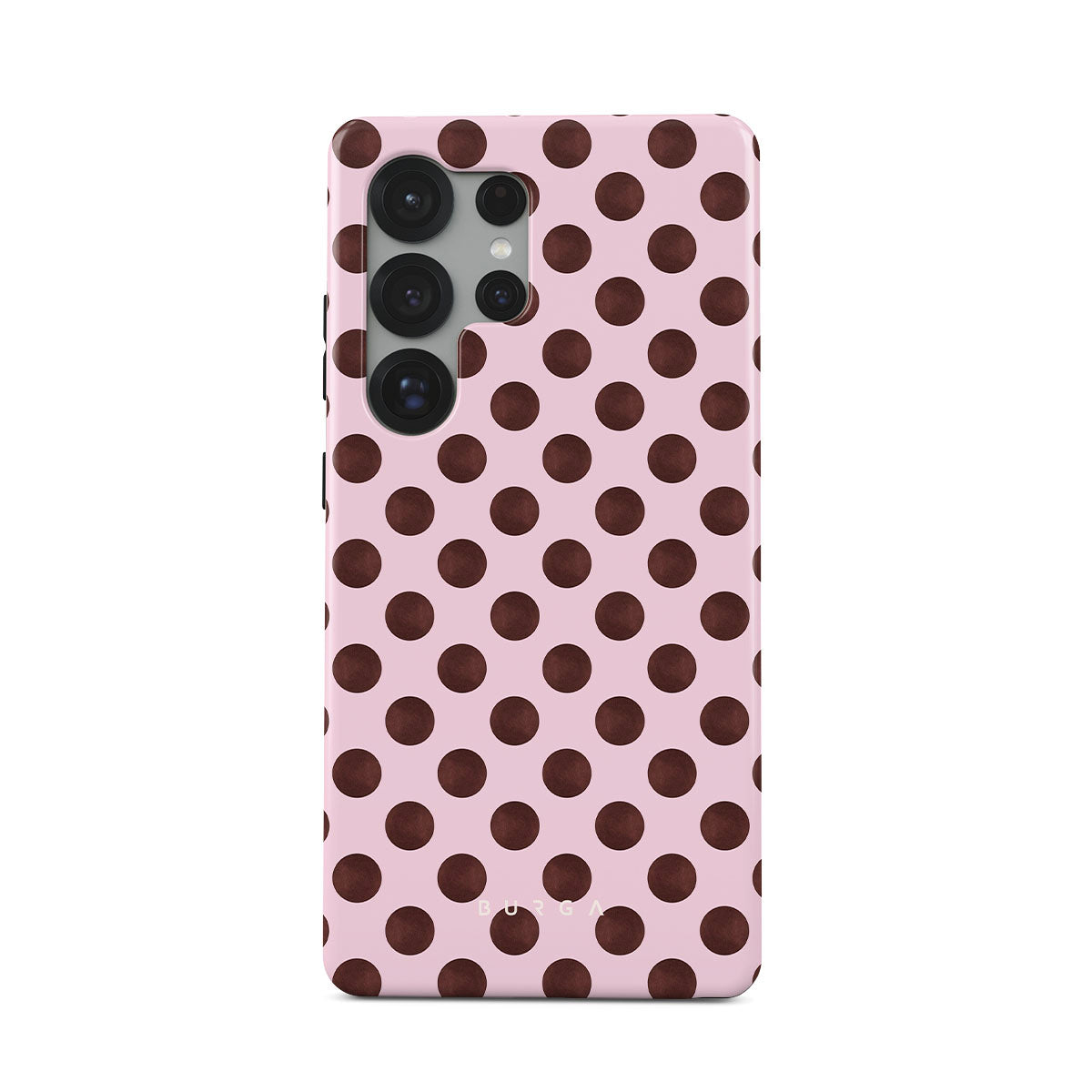 This design features: a retro polka dot pattern, pink background with brown polka dots.