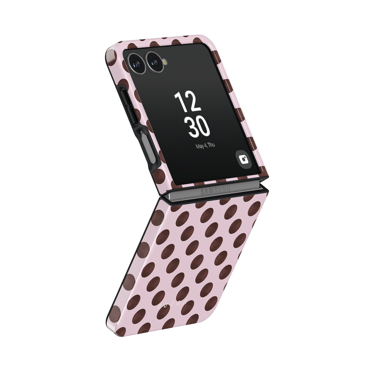 This design features: a retro polka dot pattern, pink background with brown polka dots.