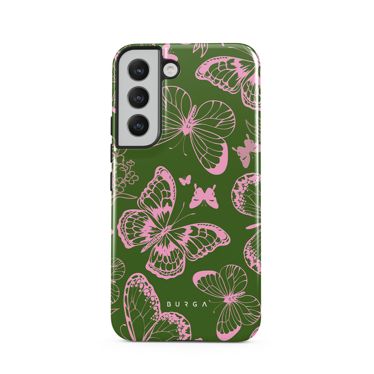 A retro-inspired masterpiece, this Samsung Galaxy S22 phone case features a delightful butterfly print that's sure to take you on a trip down memory lane. Inspired by the carefree spirit of the groovy era, this case reminds you to live your best life with No Regrets and embrace every moment. With this enchanting case design, you'll be ready to spread your wings and fly high, with nothing holding you back.