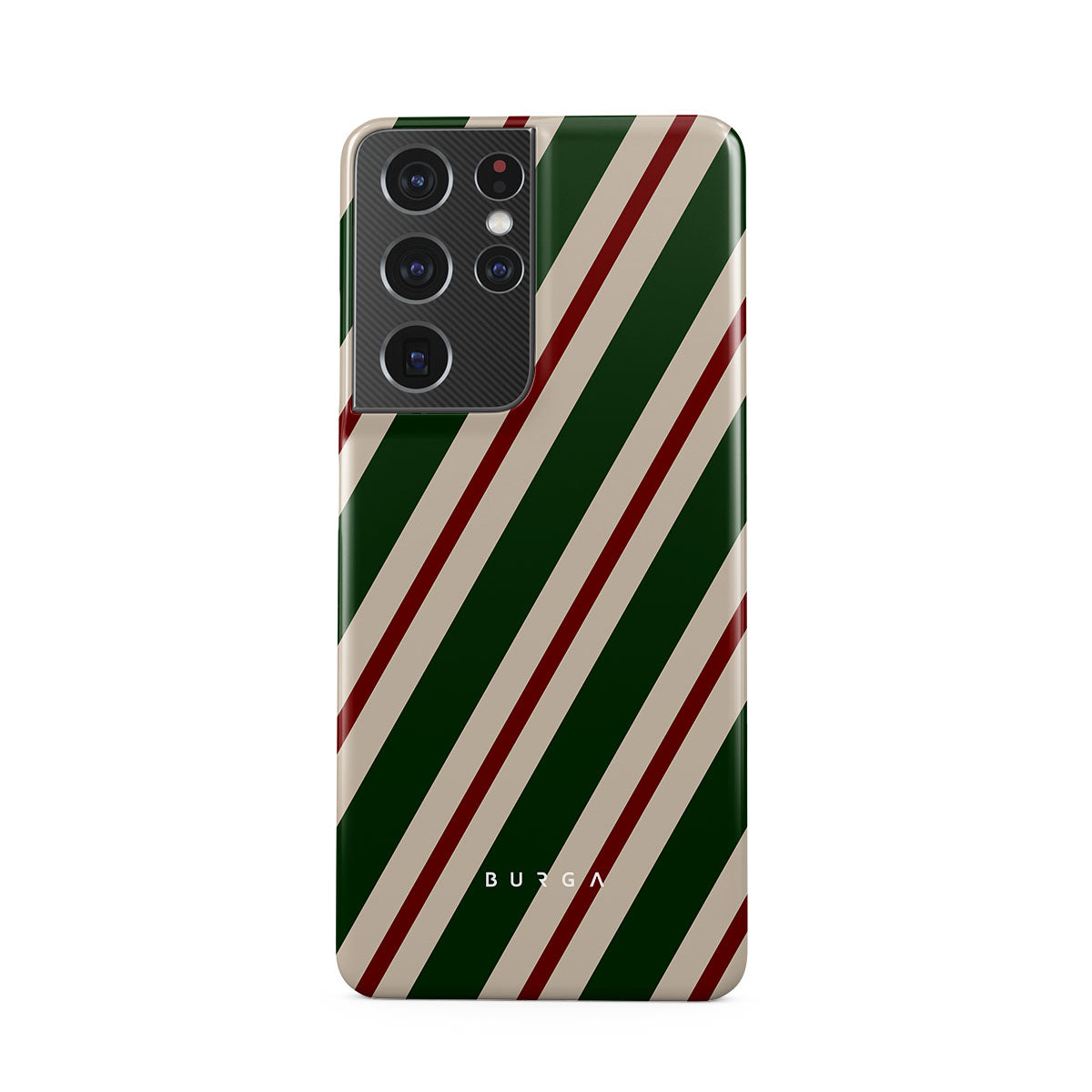 A joyful design that screams holiday spirit. Our North Pole Samsung Galaxy S21 Ultra Case phone case transports you straight to Santa's workshop. Bold green, red, and white stripes echo the joy and laughter of elves preparing for the festive season.