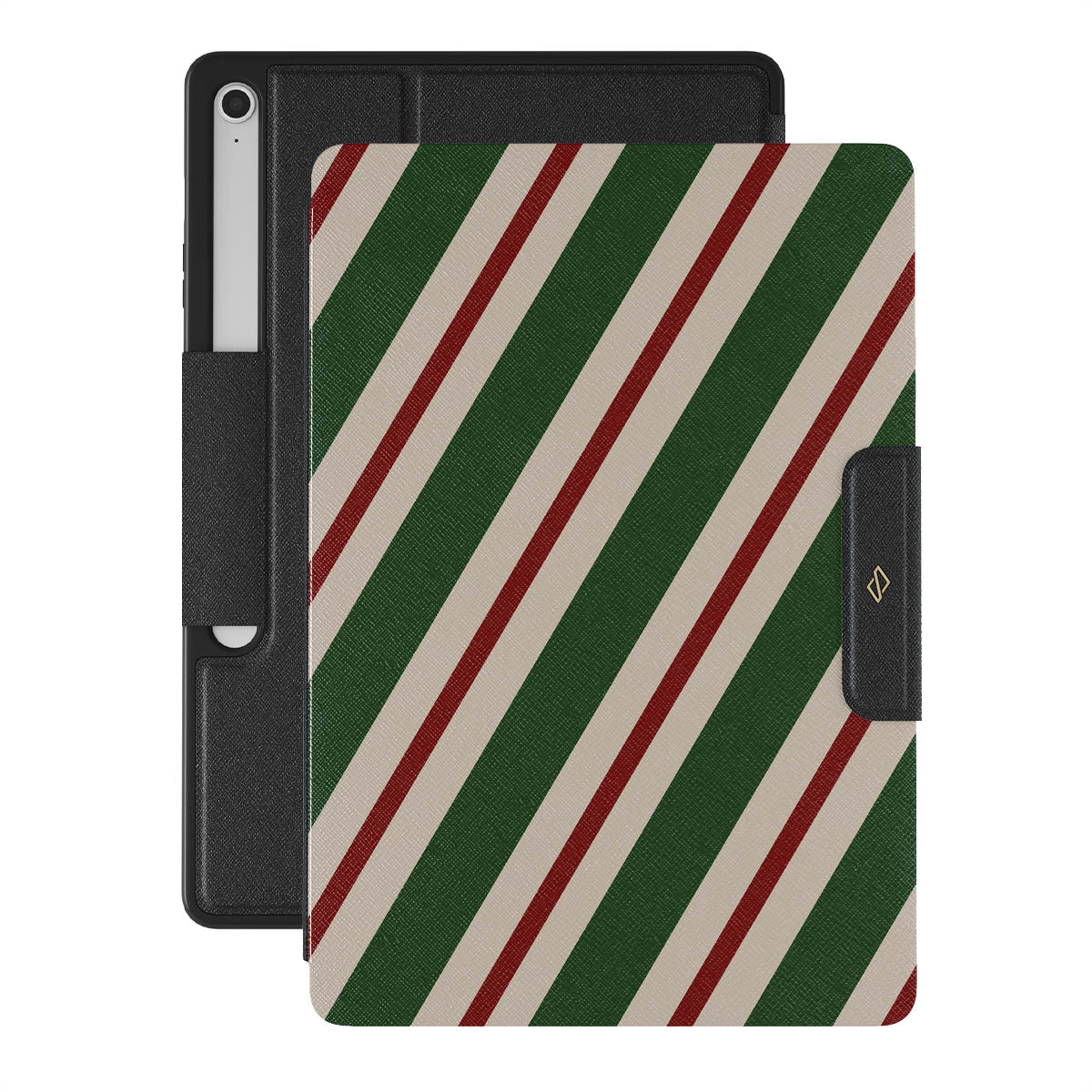 A joyful design that screams holiday spirit. Our North Pole Samsung Galaxy Tab S10+ FE folio case transports you straight to Santa's workshop. Bold green, red, and white stripes echo the joy and laughter of elves preparing for the festive season.