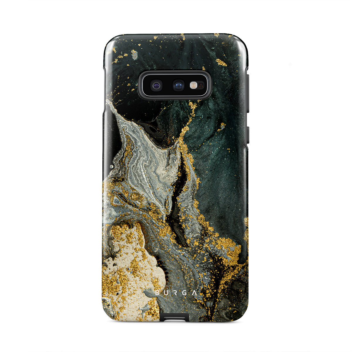 Our cute marble Northern Lights Samsung Galaxy S10E phone case showcases a combination of moss green shades in a marble pattern enriched with golden specks. The asymmetrical design reminding of a star map will add a touch of luxury and mystery to every accessory lover's collection.