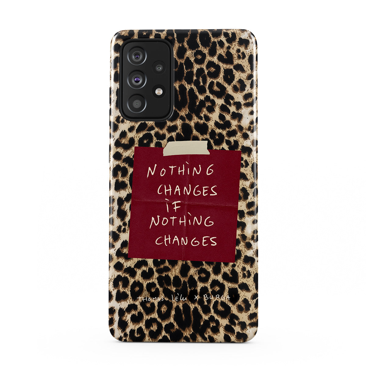 This design features: cursive text, quote, red post-it note, animal print