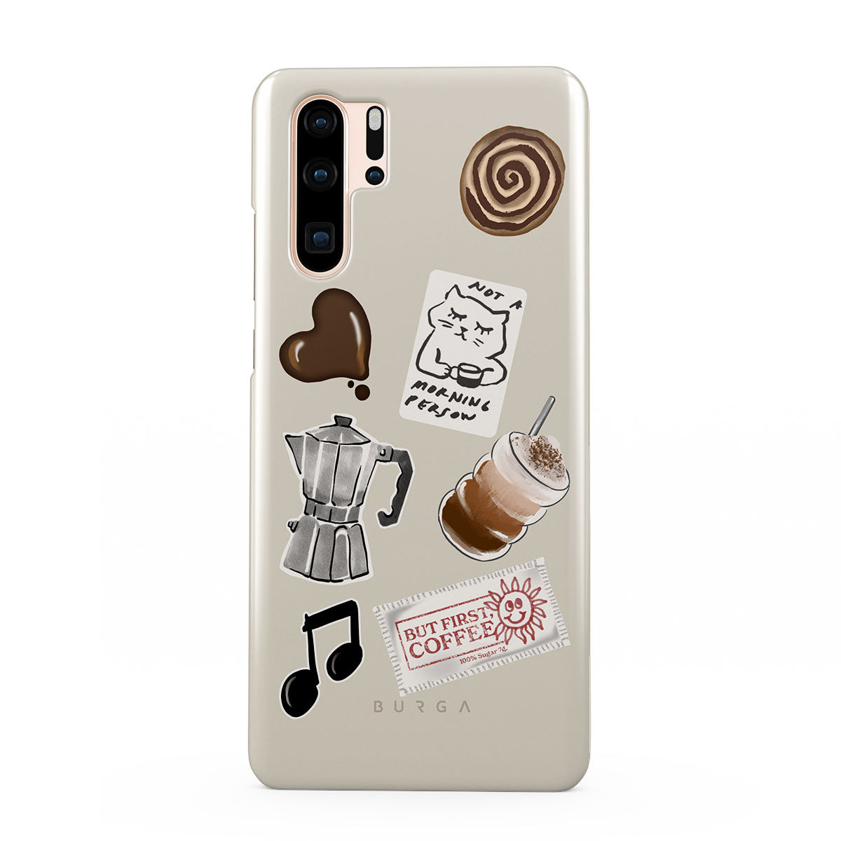 This design features: moka pot, frappe, cinnamon roll, chocolate heart, "Not a morning person" sticker, "But First, Coffee" receipt, music note