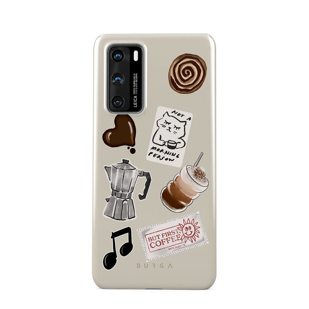 This design features: moka pot, frappe, cinnamon roll, chocolate heart, "Not a morning person" sticker, "But First, Coffee" receipt, music note