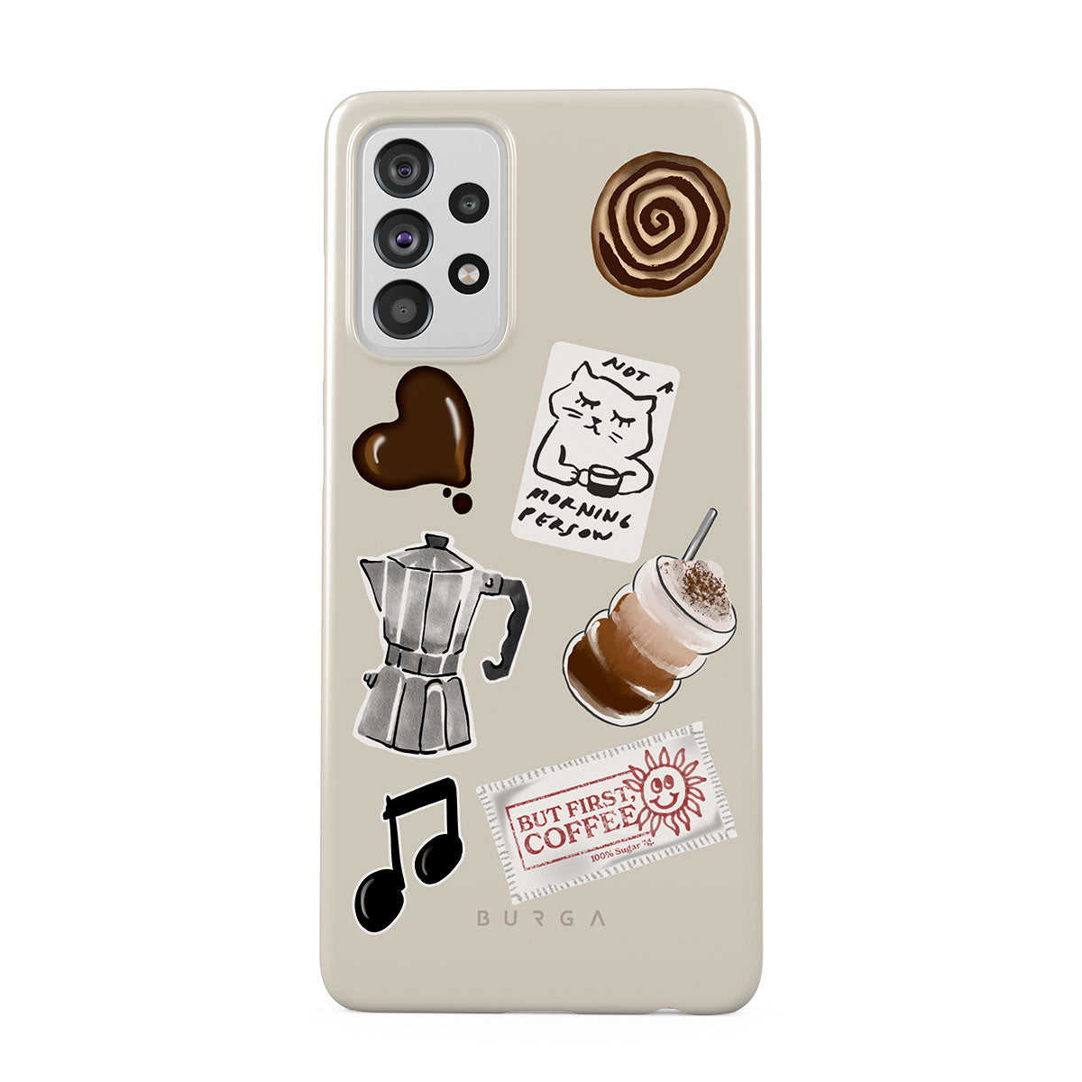 This design features: moka pot, frappe, cinnamon roll, chocolate heart, "Not a morning person" sticker, "But First, Coffee" receipt, music note