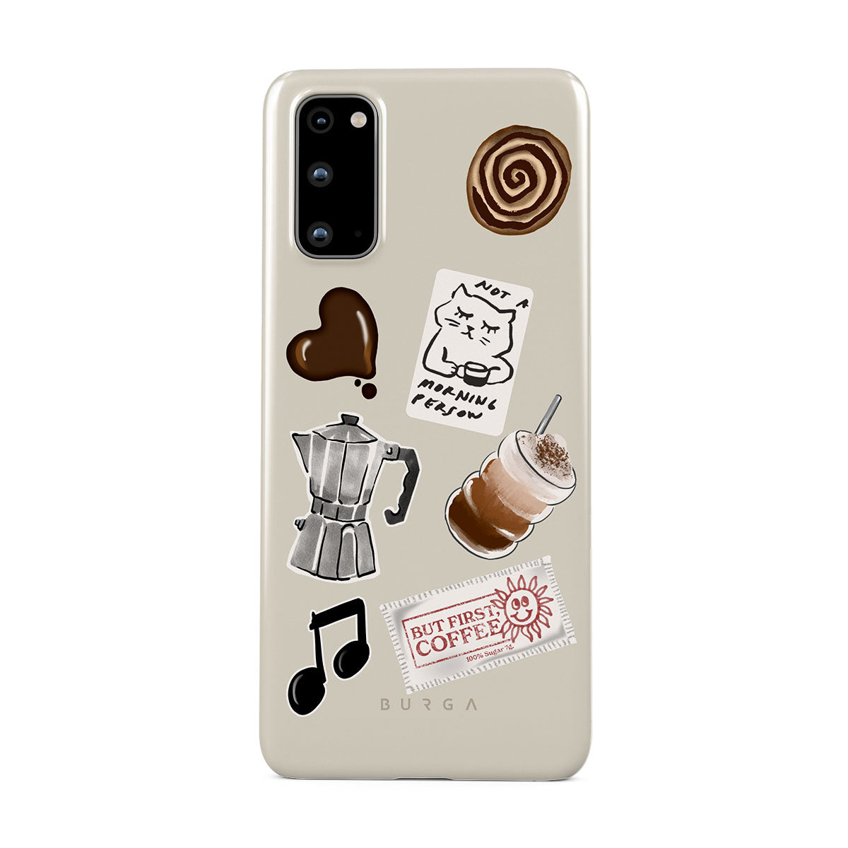 This design features: moka pot, frappe, cinnamon roll, chocolate heart, "Not a morning person" sticker, "But First, Coffee" receipt, music note