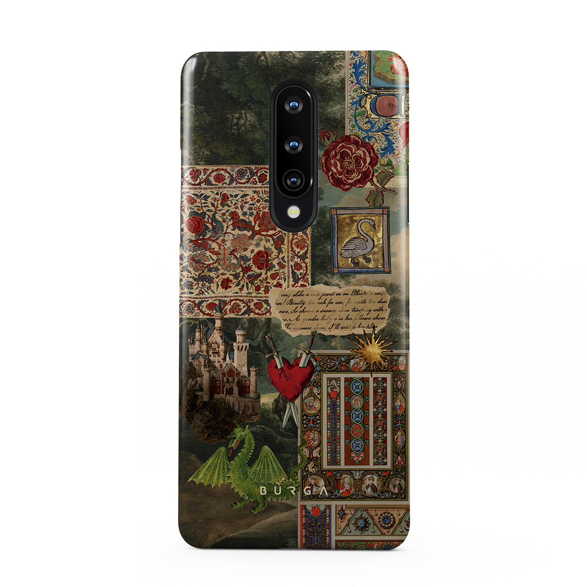 This design features: handwritten calligraphy font, vintage print, medieval design, floral pattern, old book illustrations, heart, dragon, castle