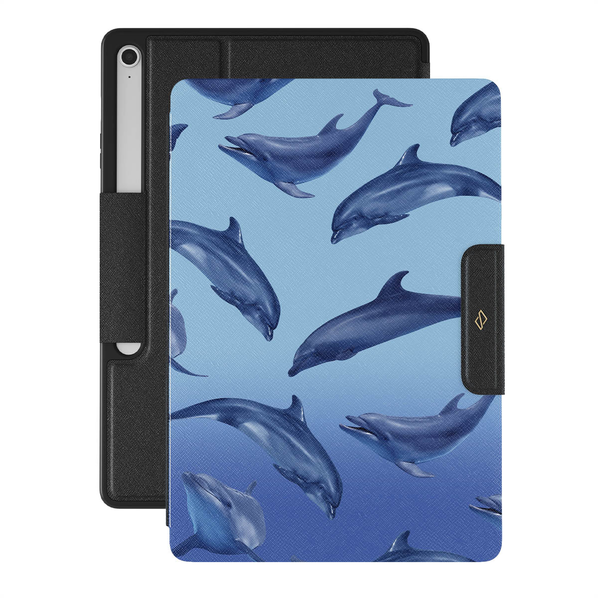 Our Ocean Cowboy Samsung Galaxy Tab S10+ FE folio case features majestic dolphins soaring across a sapphire ocean, symbolizing the untamed beauty and mystery of the deep blue. It's a call to the wild, right in your hands.