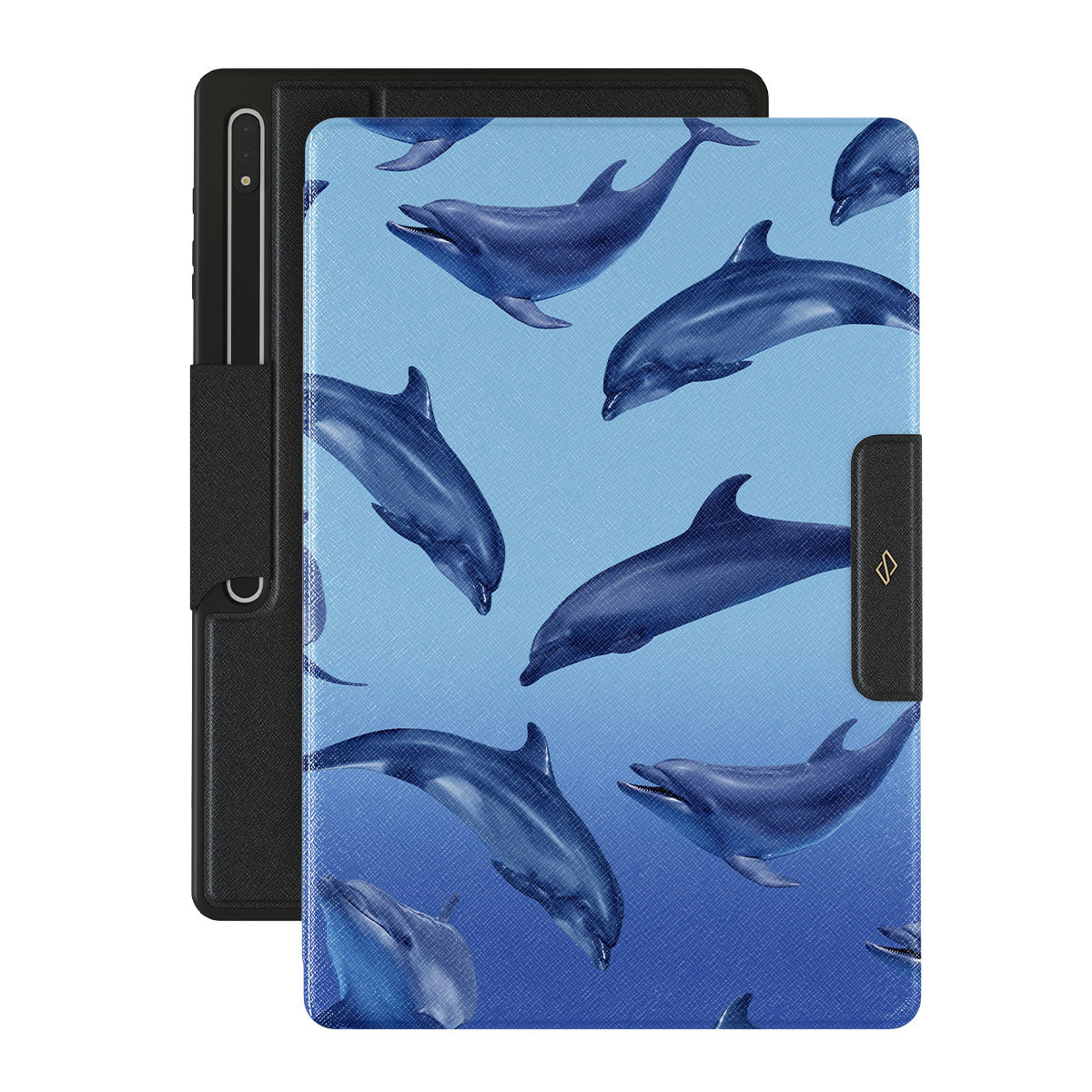 Our Ocean Cowboy Samsung Galaxy Tab S8 Ultra folio case features majestic dolphins soaring across a sapphire ocean, symbolizing the untamed beauty and mystery of the deep blue. It's a call to the wild, right in your hands.