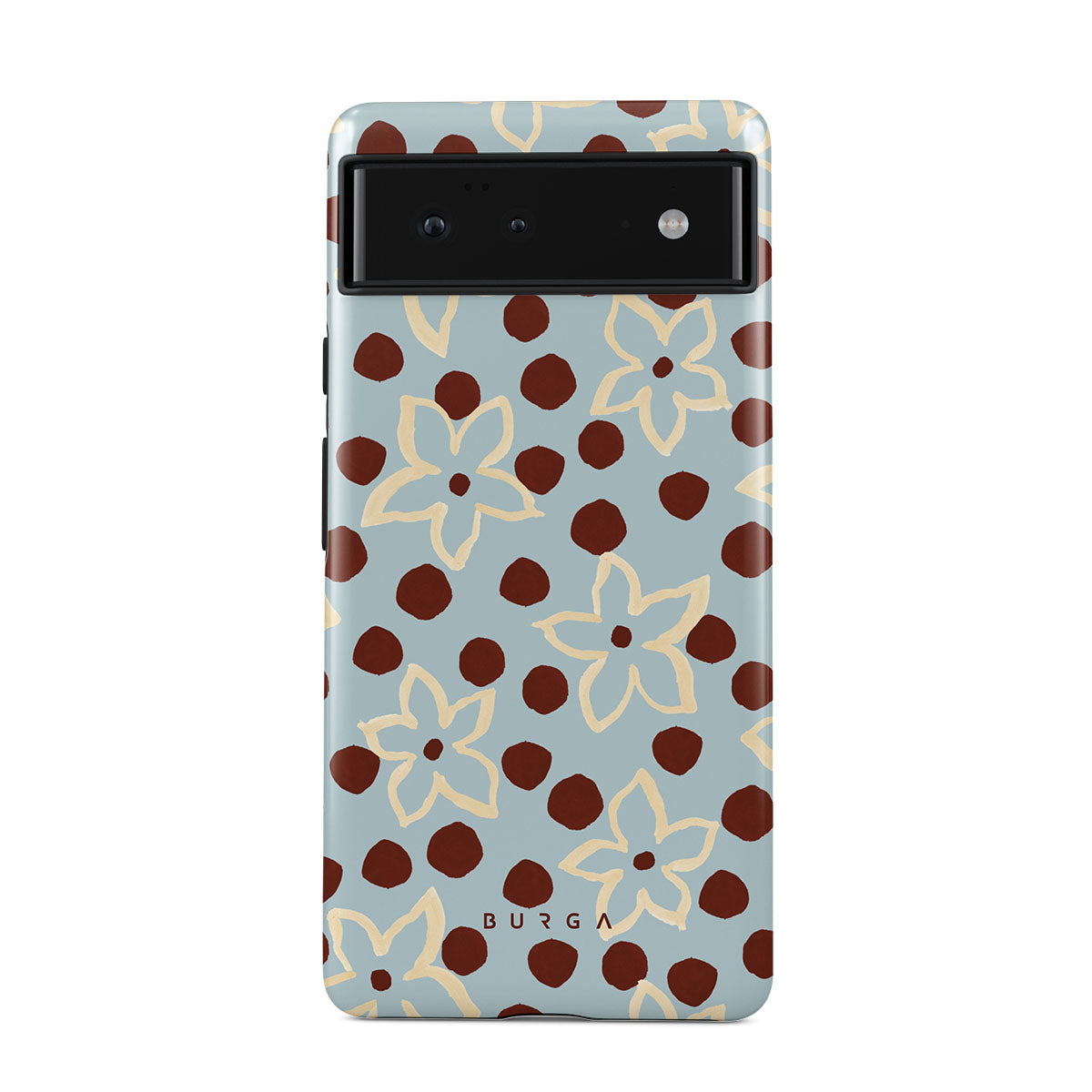 The Frutaria Google Pixel 6 Pro phone case design design: retro surf motel wallpaper meets vintage ceramics. The soft florals, earthy dots, and cool-toned palette give major “forgotten seaside town in the ‘70s” energy.