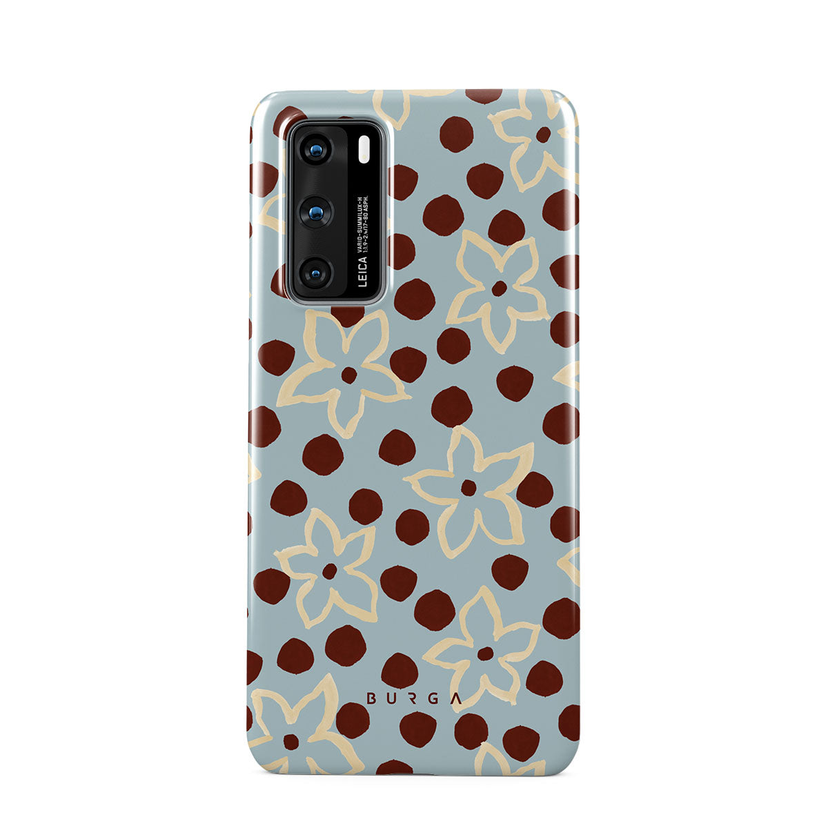 The Frutaria Huawei P40 phone case design design: retro surf motel wallpaper meets vintage ceramics. The soft florals, earthy dots, and cool-toned palette give major “forgotten seaside town in the ‘70s” energy.
