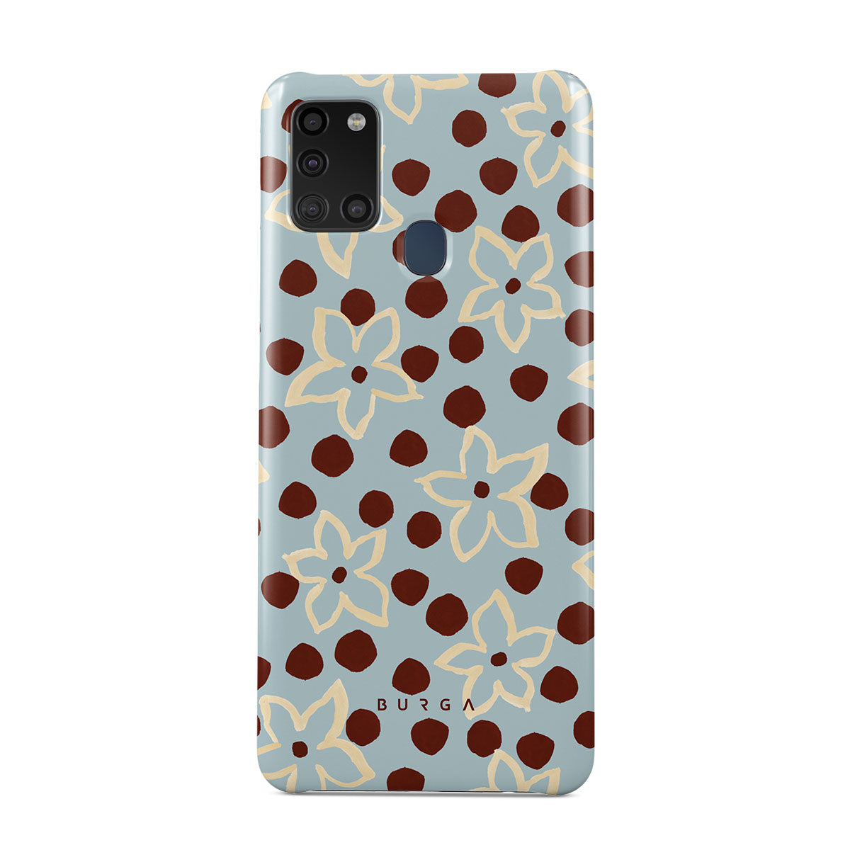 The Frutaria Samsung Galaxy A21s 4G phone case design design: retro surf motel wallpaper meets vintage ceramics. The soft florals, earthy dots, and cool-toned palette give major “forgotten seaside town in the ‘70s” energy.