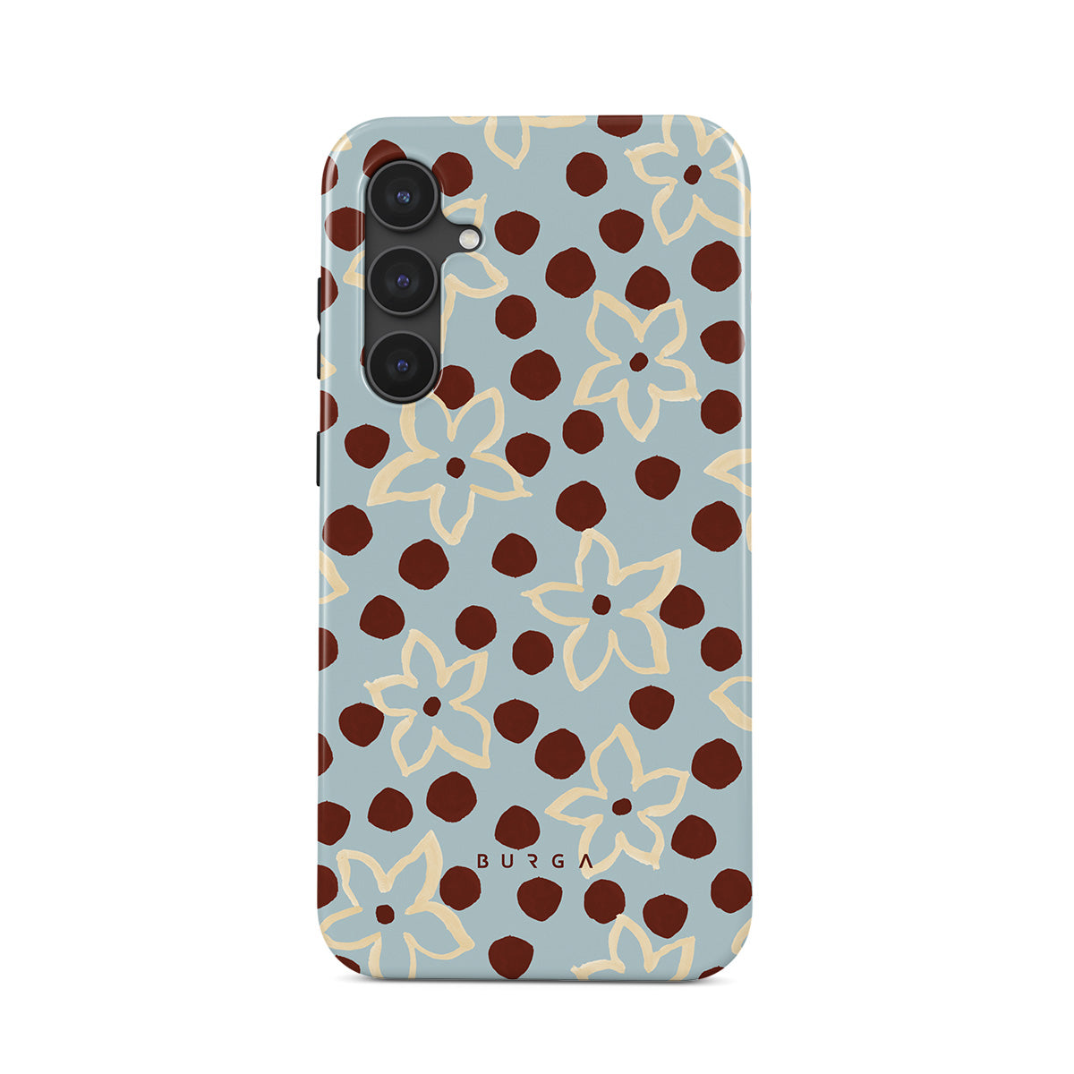 The Frutaria Samsung Galaxy S23 FE phone case design design: retro surf motel wallpaper meets vintage ceramics. The soft florals, earthy dots, and cool-toned palette give major “forgotten seaside town in the ‘70s” energy.