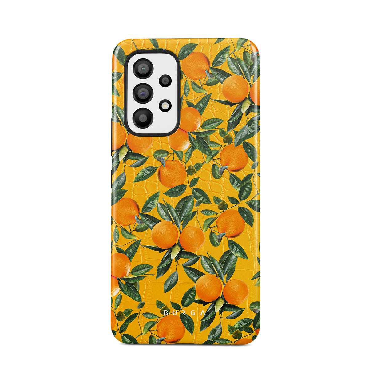 Orange Lemonade Samsung Galaxy A53 phone case showcases a unique combination of vibrant orange croco design with plenty of mouth-watering oranges on top. With this energetic design, protect your phone and keep your spirits up.