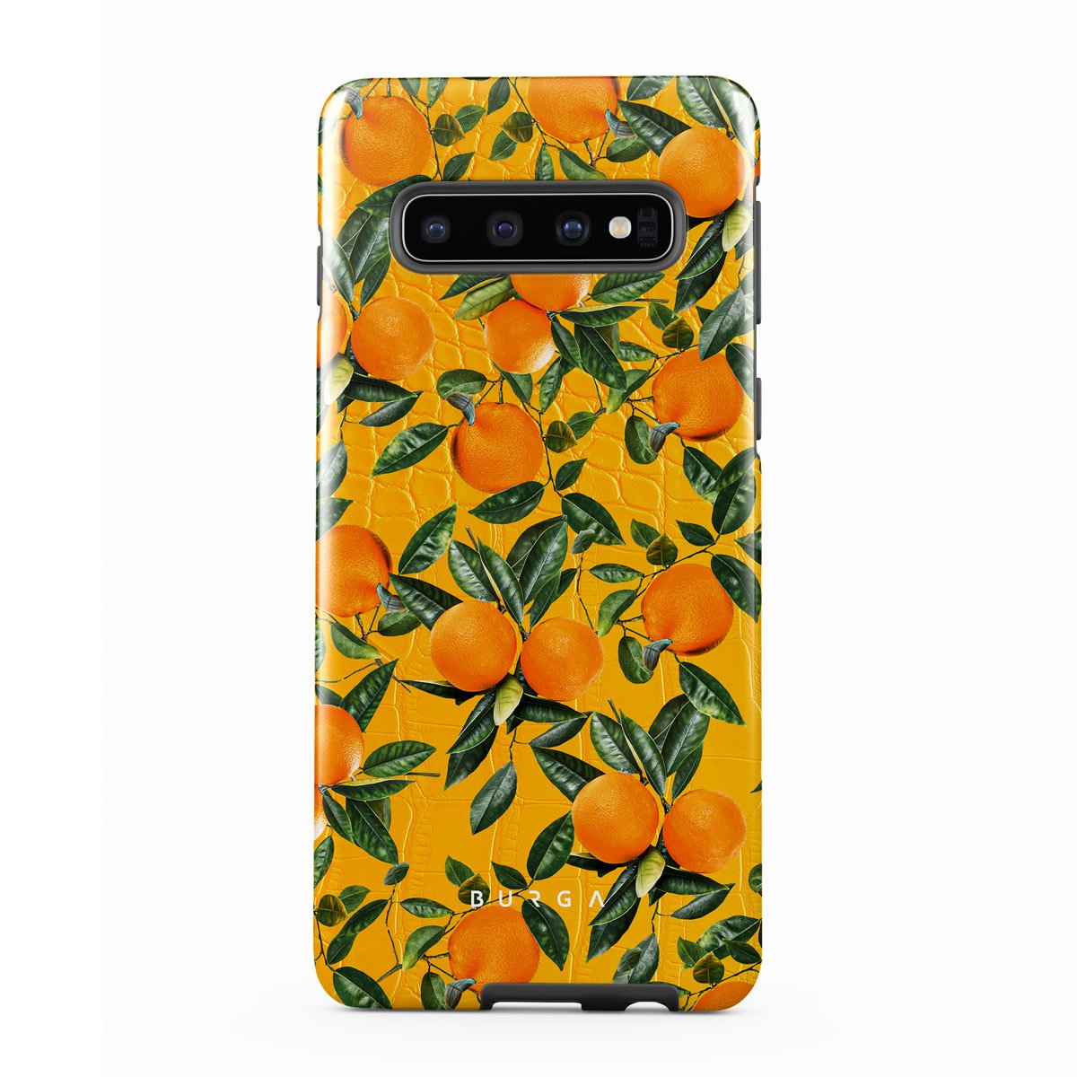 Orange Lemonade Samsung Galaxy S10 phone case showcases a unique combination of vibrant orange croco design with plenty of mouth-watering oranges on top. With this energetic design, protect your phone and keep your spirits up.