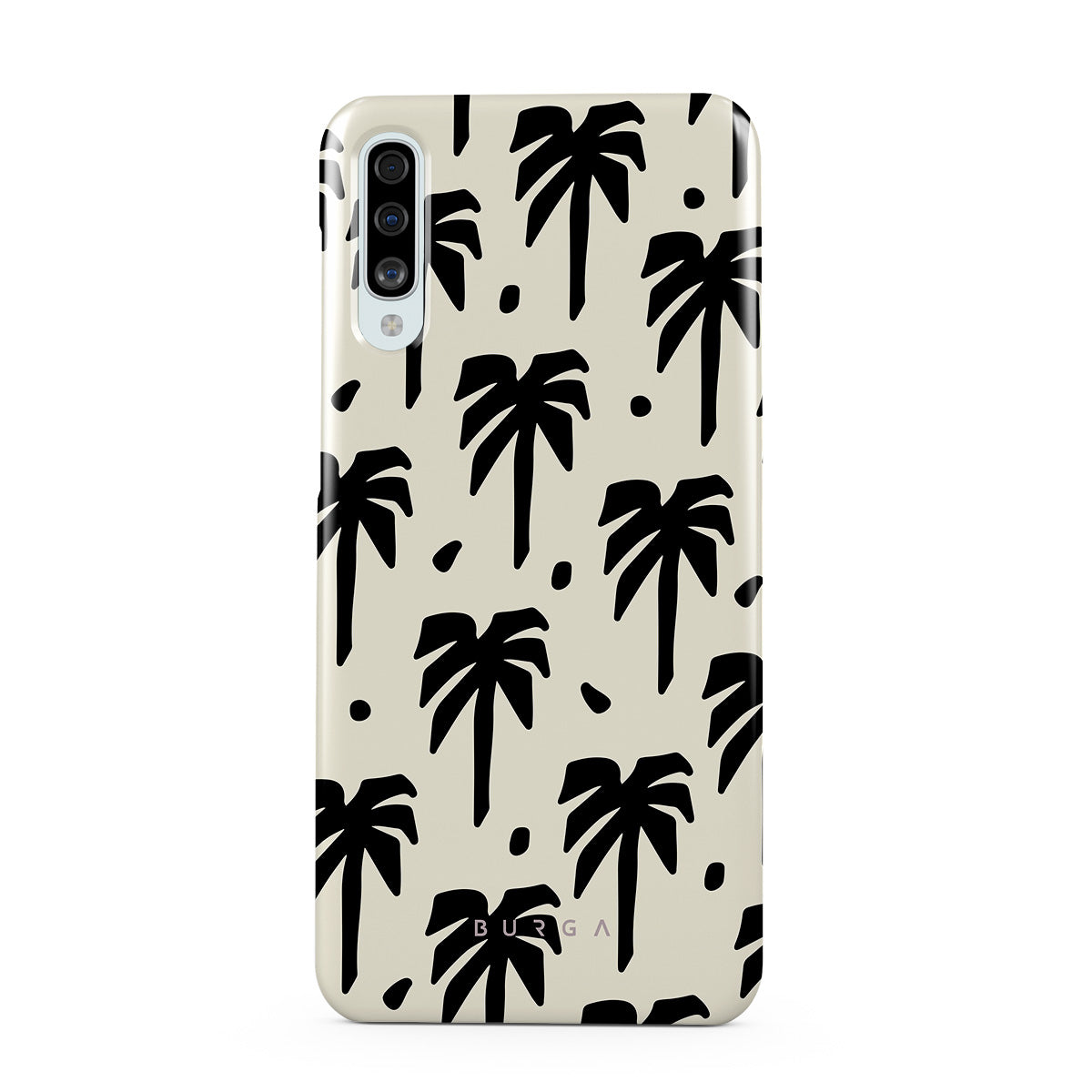 A peaceful haven right at your fingertips. The design contrasts black palm silhouettes against a calming light backdrop. Our Paraíso Samsung Galaxy A50 phone case is your passport to an everlasting tropical escape.