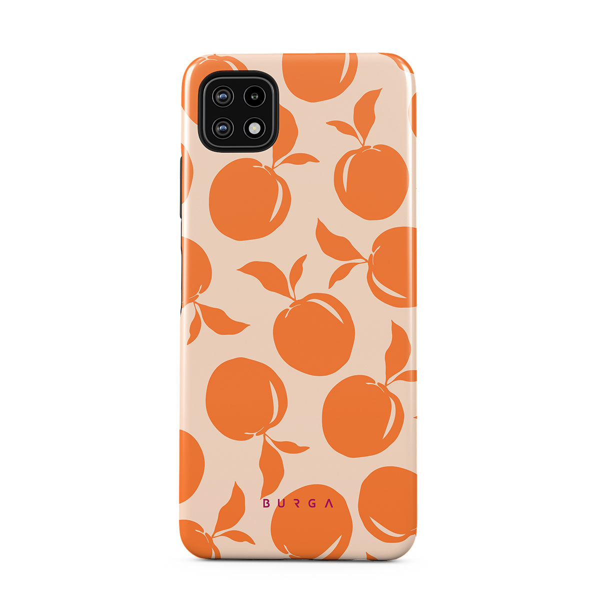 Picture a sun-soaked grove where ripe, juicy peaches glow with a radiant orange vibrance, their succulent aroma filling the warm air. Our Peach Fuzz design infuses your Samsung Galaxy A22 5G phone case with a lively, sun-kissed charm, perfectly capturing the essence of carefree, joyful summer days.