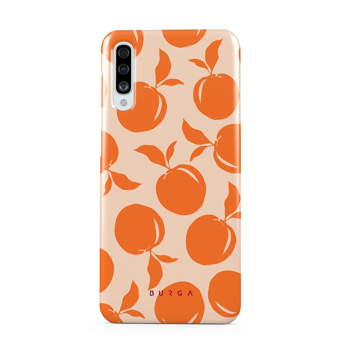 Picture a sun-soaked grove where ripe, juicy peaches glow with a radiant orange vibrance, their succulent aroma filling the warm air. Our Peach Fuzz design infuses your Samsung Galaxy A50 phone case with a lively, sun-kissed charm, perfectly capturing the essence of carefree, joyful summer days.