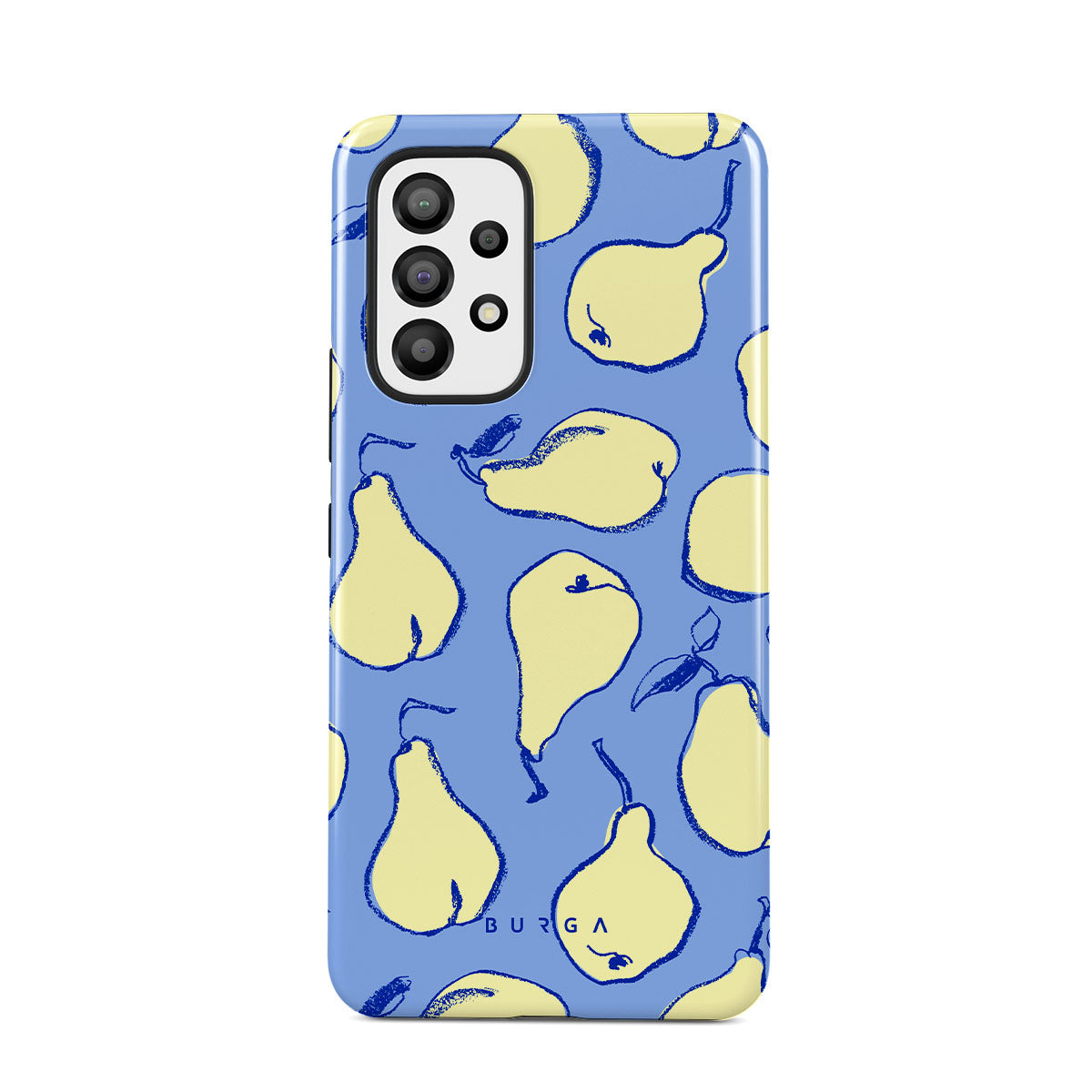 Step into a playful paradise with Pear Crush. Each pear is outlined with a lively, hand-drawn charm. This design brings a playful vibe to your Samsung Galaxy A73 phone case, perfect for those who love to embrace the lighter, more joyful side of life.