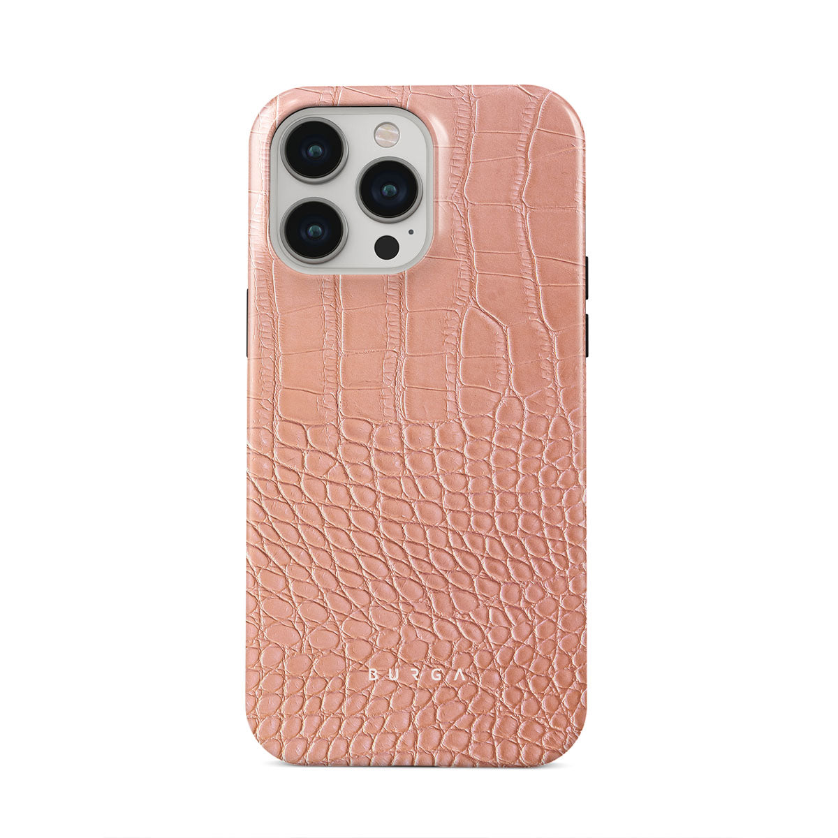 Our Pink Croco iPhone 14 Pro phone case features a classic crocodile design reimagined and showcased in a soft coral shade. The new take on the dangerous animal print will add a touch of softness to your style while simultaneously offering heavy-duty protection to your device.