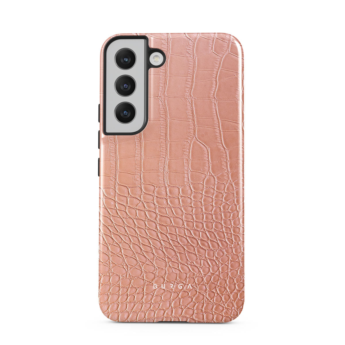 Our Pink Croco Samsung Galaxy S22 phone case features a classic crocodile design reimagined and showcased in a soft coral shade. The new take on the dangerous animal print will add a touch of softness to your style while simultaneously offering heavy-duty protection to your device.