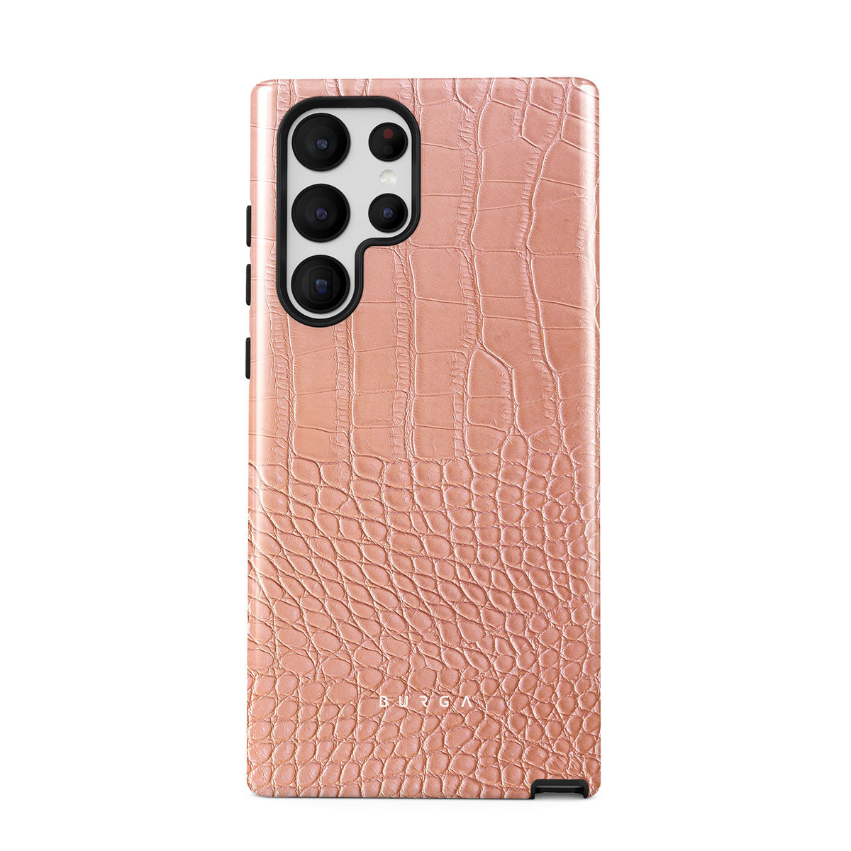 Our Pink Croco Samsung Galaxy S22 Ultra phone case features a classic crocodile design reimagined and showcased in a soft coral shade. The new take on the dangerous animal print will add a touch of softness to your style while simultaneously offering heavy-duty protection to your device.