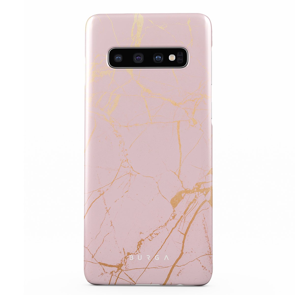 Growing under the beautiful sky and warmed by the rays of the sunshine, when ripped, peach offers you sweetness and softness. This is why our Peachy Gold Samsung Galaxy S10 Plus phone case design adds a bit of golden color to the pink marble dream making a protective phone case both pretty and durable.