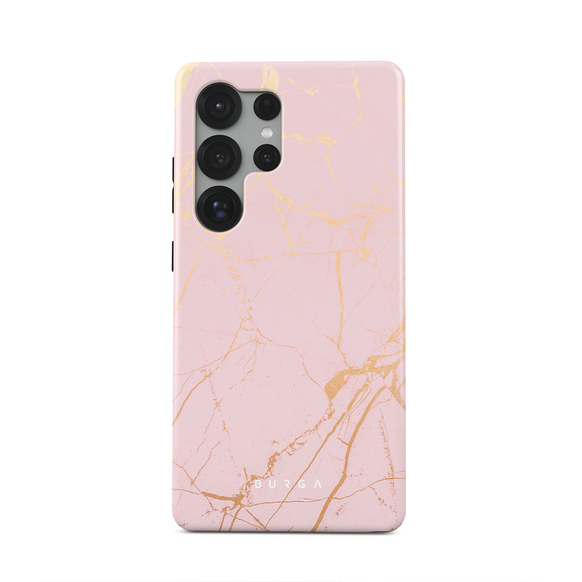 Growing under the beautiful sky and warmed by the rays of the sunshine, when ripped, peach offers you sweetness and softness. This is why our Peachy Gold Samsung Galaxy S25 Ultra phone case design adds a bit of golden color to the pink marble dream making a protective phone case both pretty and durable.