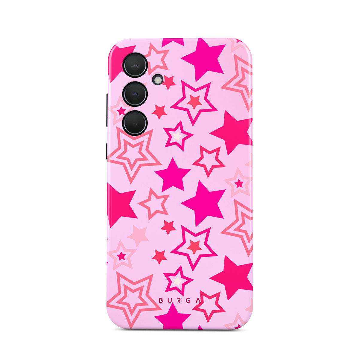Buckle up for a starry ride, and let's twirl under the Plastic Sky. Neon stars shimmering across a cheeky rose-tinted galaxy create a playful space-disco atmosphere. Be the center of the universe with our Plastic Sky Samsung Galaxy A35 phone case!