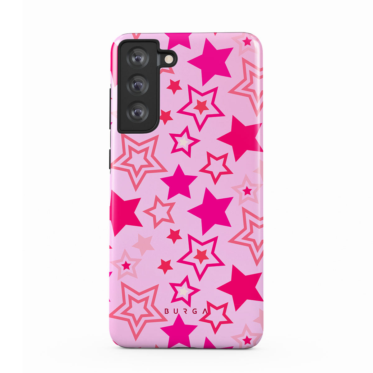 Buckle up for a starry ride, and let's twirl under the Plastic Sky. Neon stars shimmering across a cheeky rose-tinted galaxy create a playful space-disco atmosphere. Be the center of the universe with our Plastic Sky Samsung Galaxy S21 FE phone case!