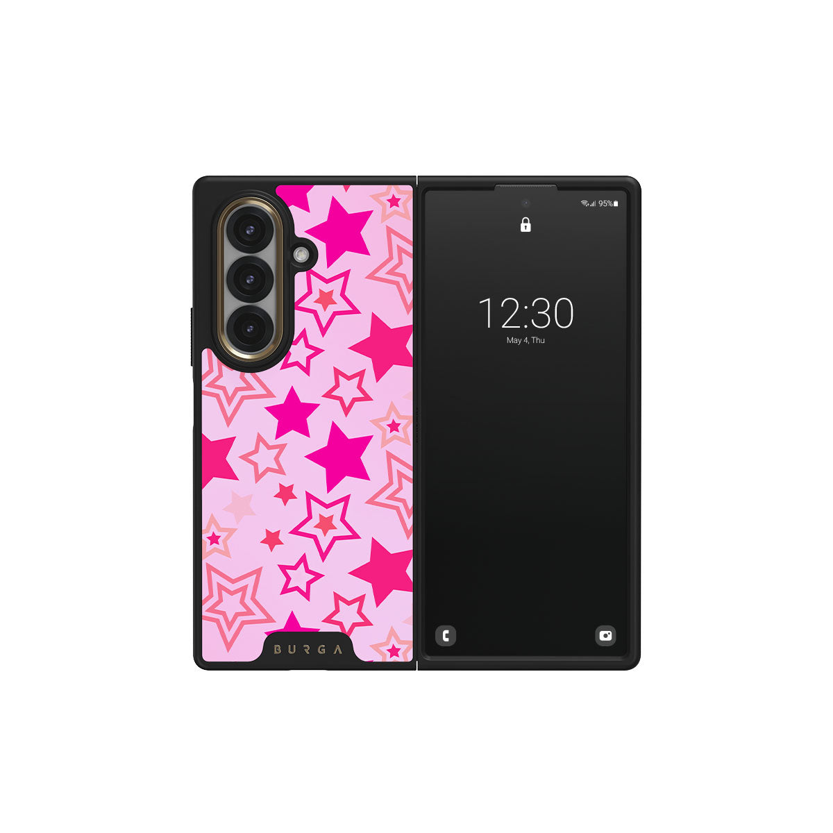 Buckle up for a starry ride, and let's twirl under the Plastic Sky. Neon stars shimmering across a cheeky rose-tinted galaxy create a playful space-disco atmosphere. Be the center of the universe with our Plastic Sky Samsung Galaxy Z Fold 7 phone case!